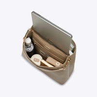 I purchased the 16" Iris in Stone a few months ago after looking for a stylish handbag with a laptop sleeve for ages. I have no regrets. It's gorgeous! Great quality, the colour goes with everything and it ticks all the boxes. It is a little on the heavier side, so when carrying say a laptop and a water bottle it tends to get a tad heavy, but thanks to the sturdy straps this doesn't pose any issues. The magnetic closures ensure that all my items are safe from pickpockets on my daily London commute. I also love the shape of the bag, different but still elegant and classy.