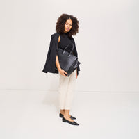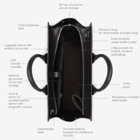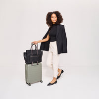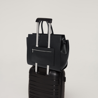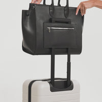 Our Lotus Luggage tote is an enhanced version of our Lotus tote, with the addition of a wide luggage sleeve for hands-free travel. The spacious, understated Lotus Luggage tote combines timeless aesthetic and organisation in this minimalist trapezium design. The winged silhouette opens to create a broad interior with a wide padded laptop compartment and secure zipper closure ensuring every detail is considered to keep all your belongings held safe and secure. When travelling, this tote can be held by the top handles, or across the body or over the shoulder using the detachable adjustable shoulder strap for versatile carrying options, as well as completely hands-free with the secure luggage sleeve.